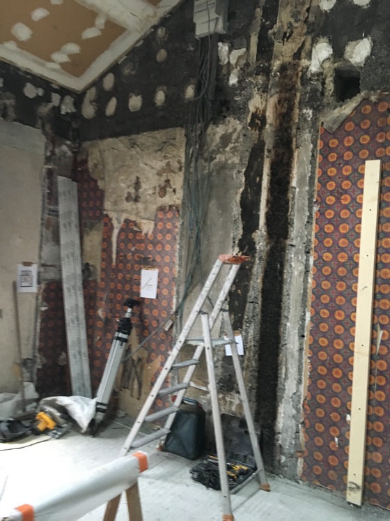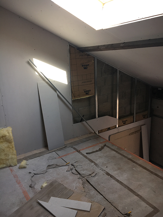 Début de la phase 2. Rencontre de l'équipe de démolisseurs/plaquistes. Chargement du matériel (rails et laine de verre pour les prochains jours). Dépose du faux plafond existant.