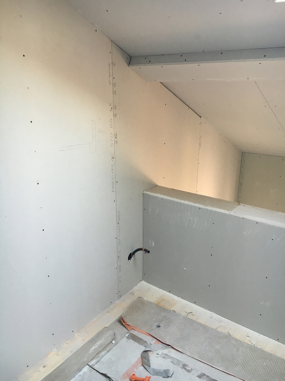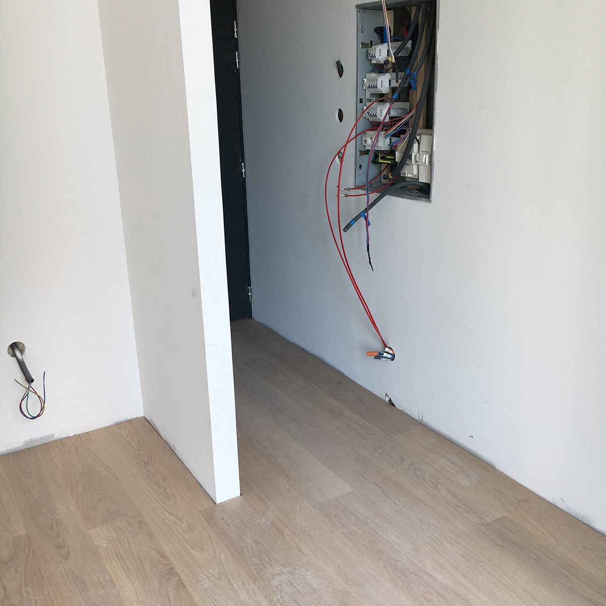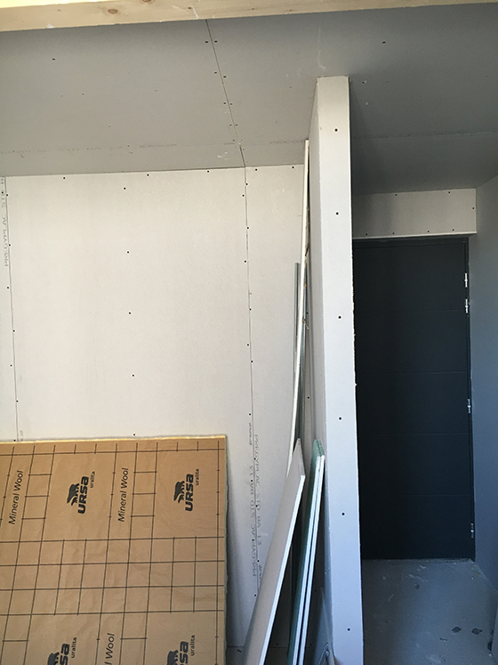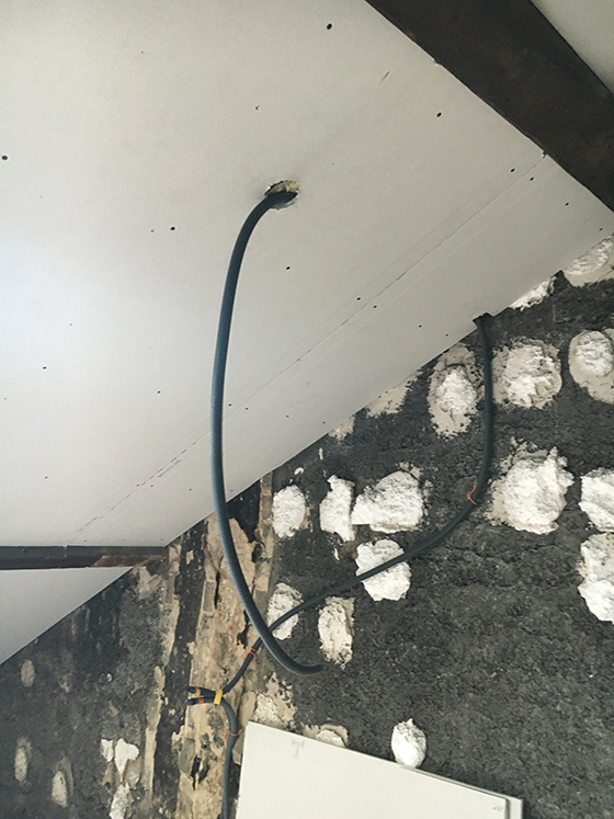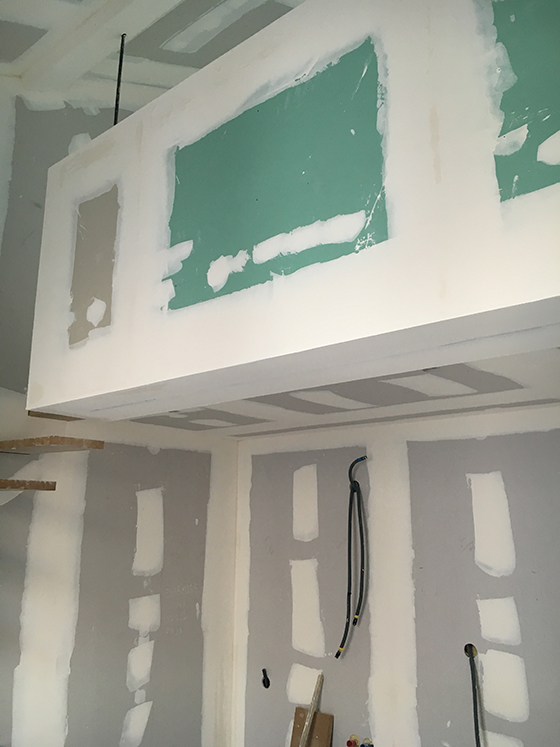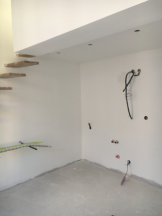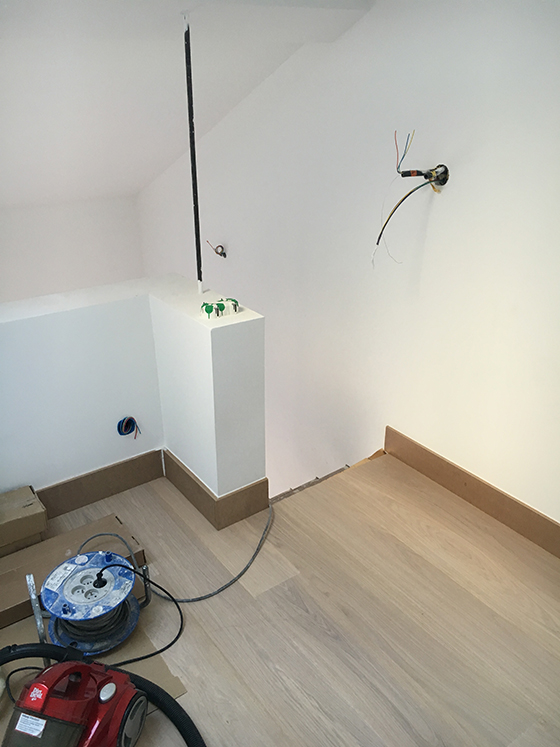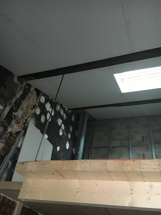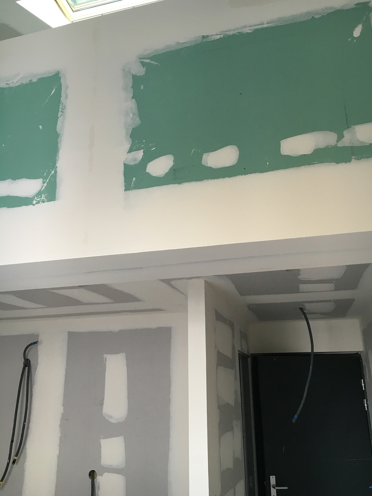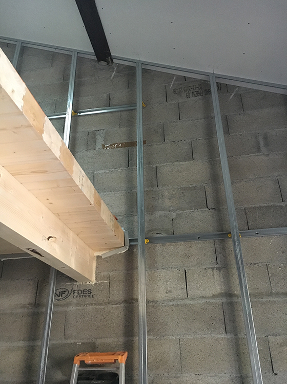 Finalisation doublage murs, poutres, garde corps mezzanine. Pose du compteur électrique encastré. Préparation des sorties électriques pour la cuisine integrée. Préparation des trous pour spots plafond.