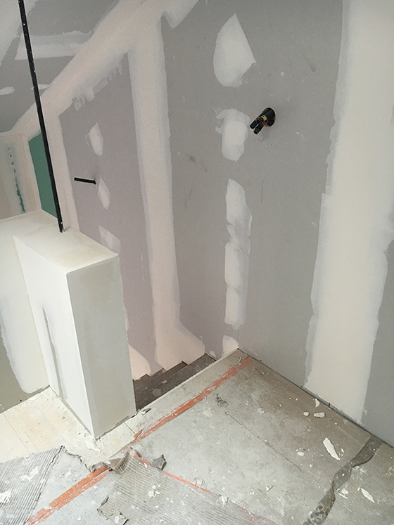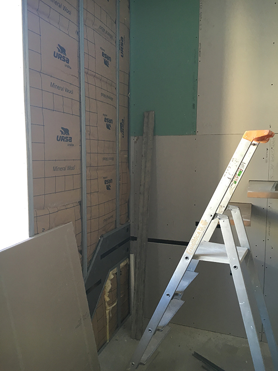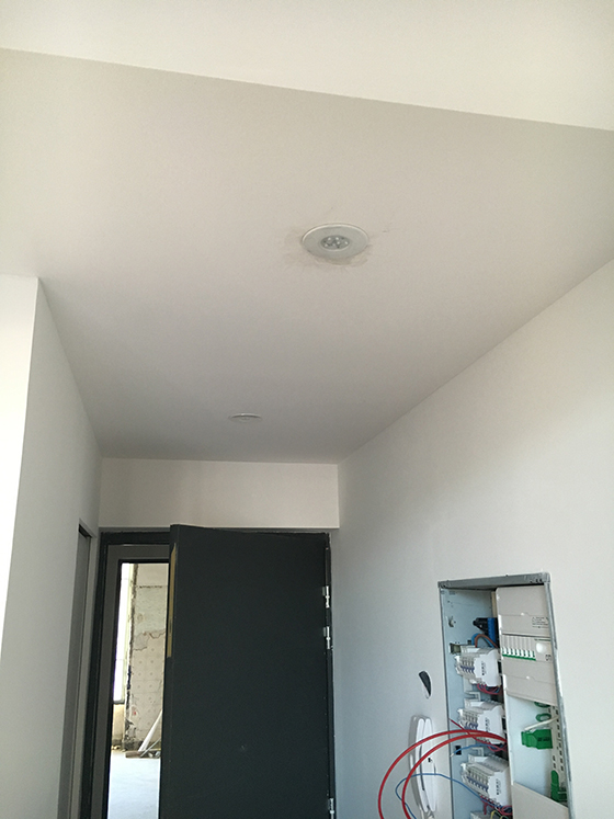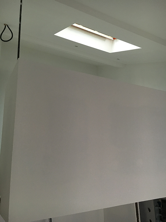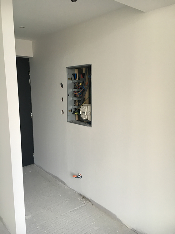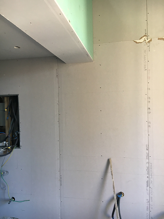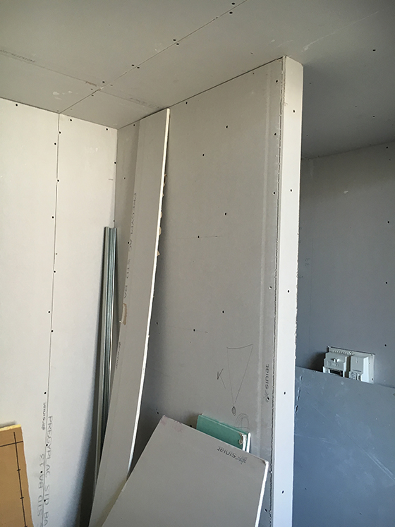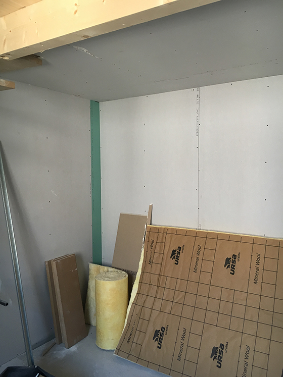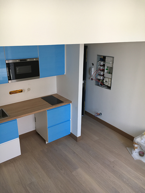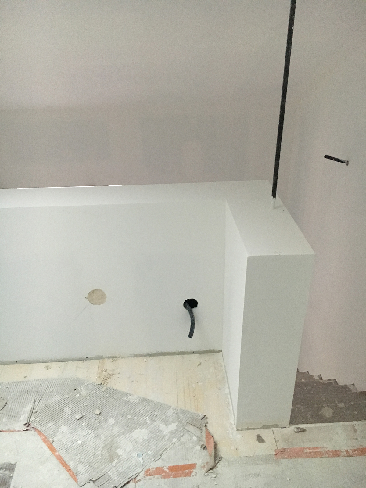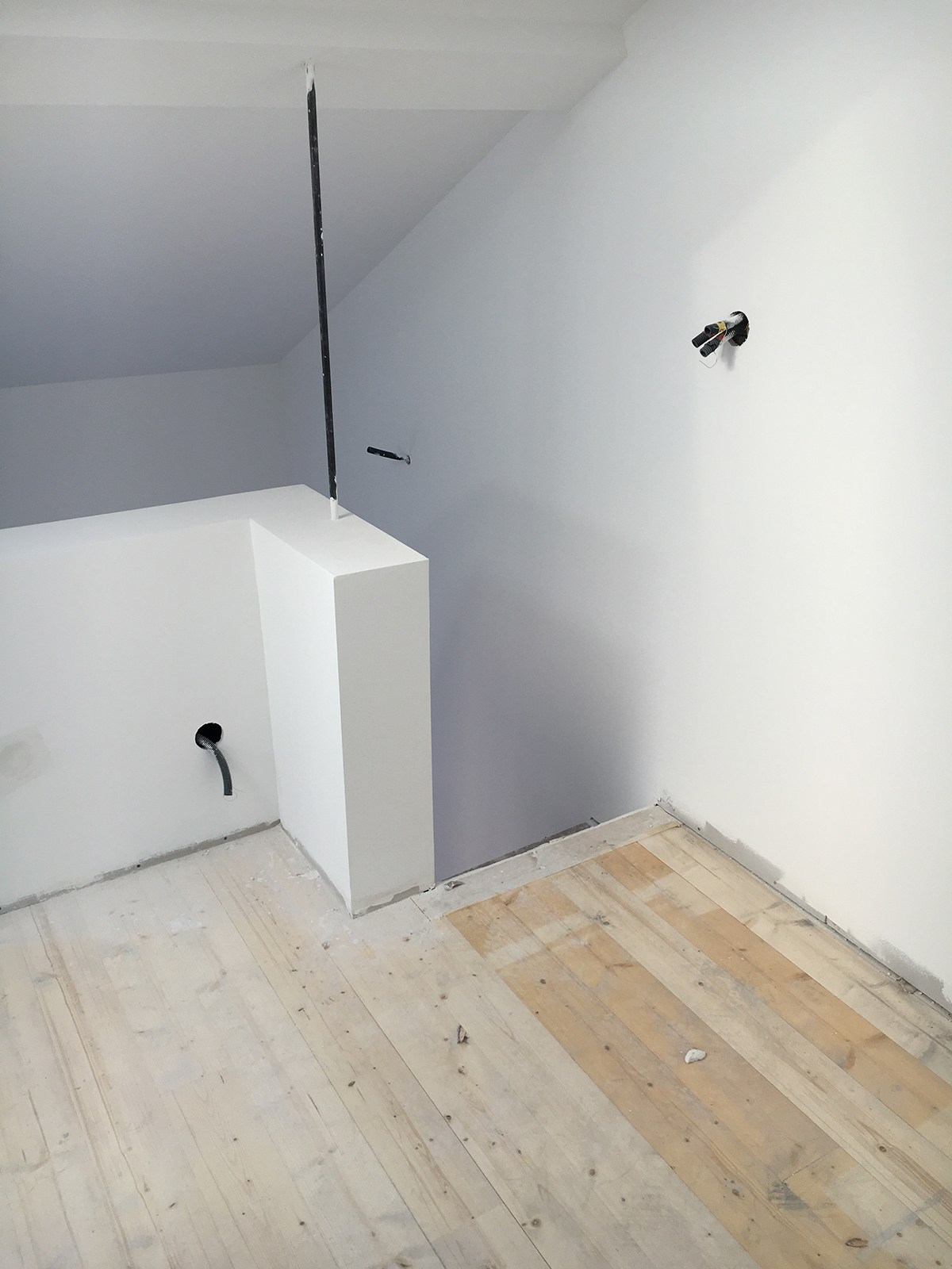 Finalisation doublage murs, poutres, garde corps mezzanine. Pose du compteur électrique encastré. Préparation des sorties électriques pour la cuisine integrée. Préparation des trous pour spots plafond.