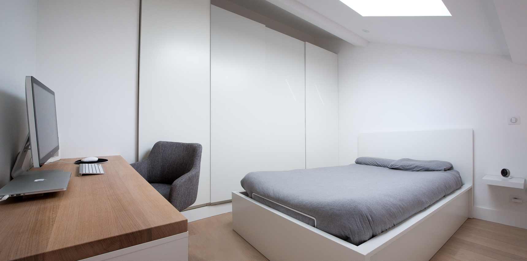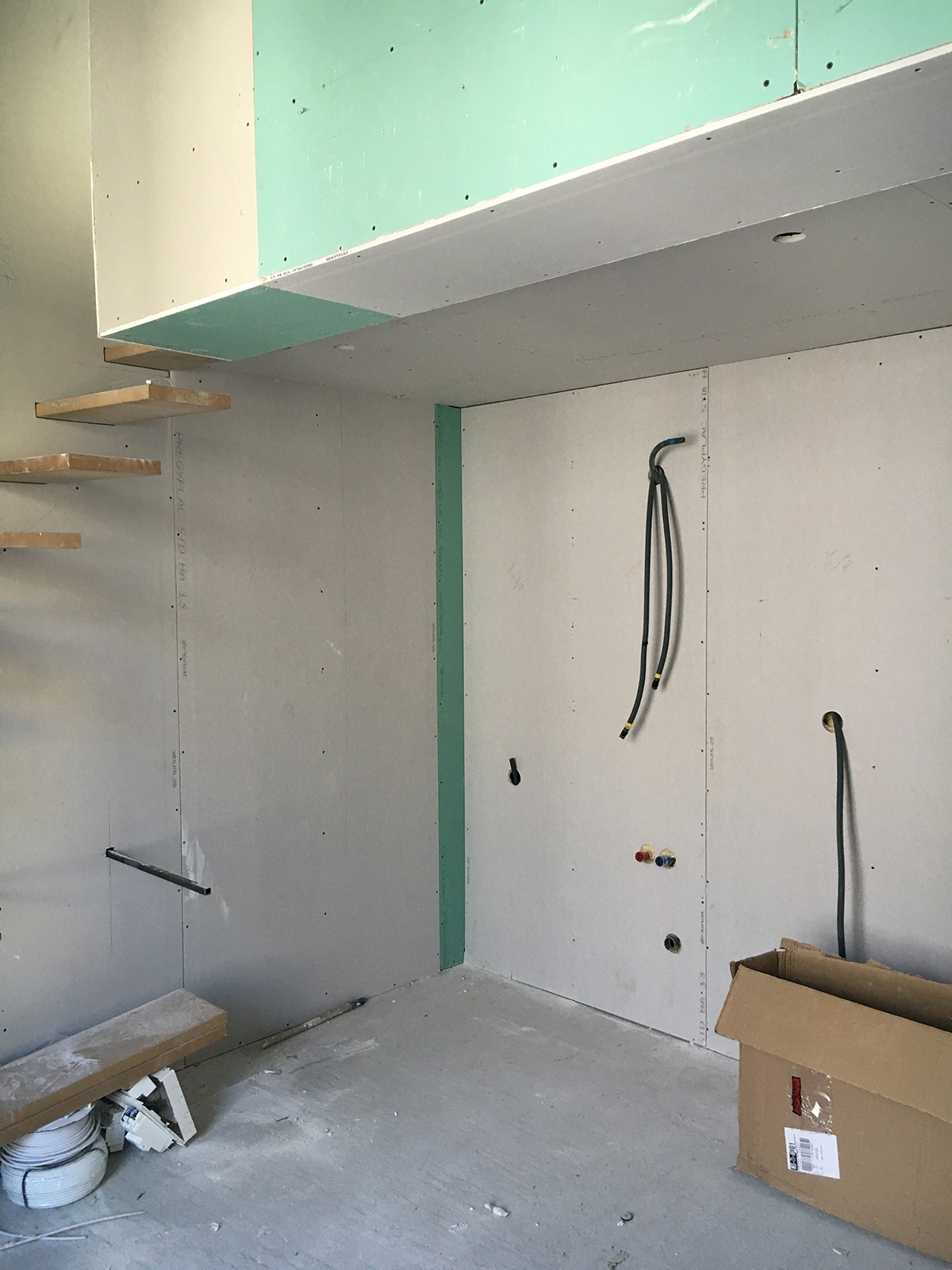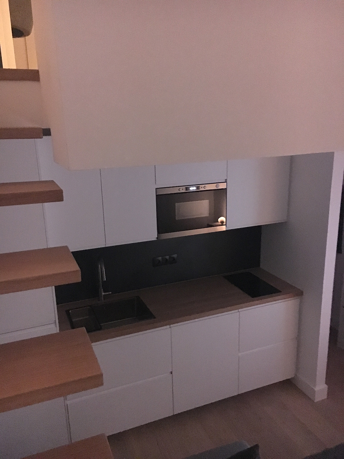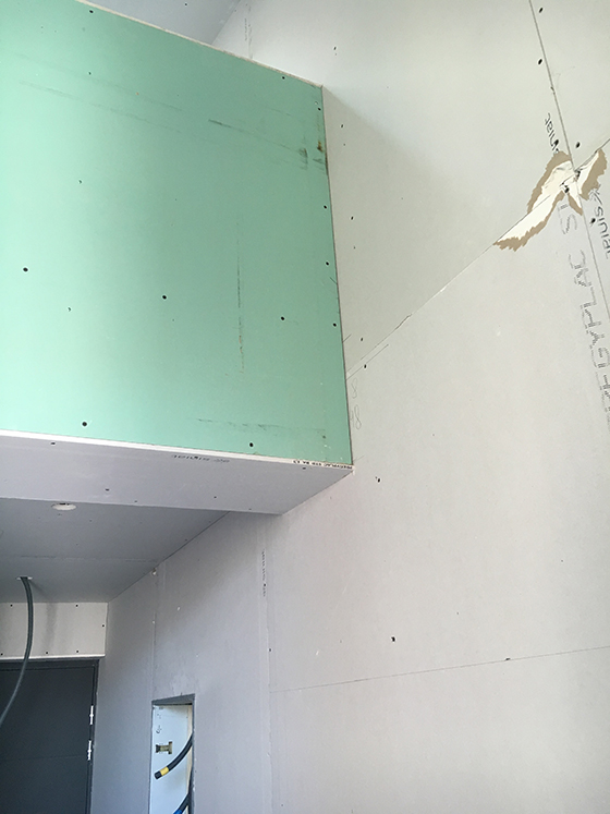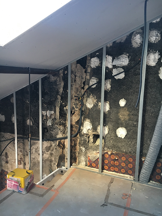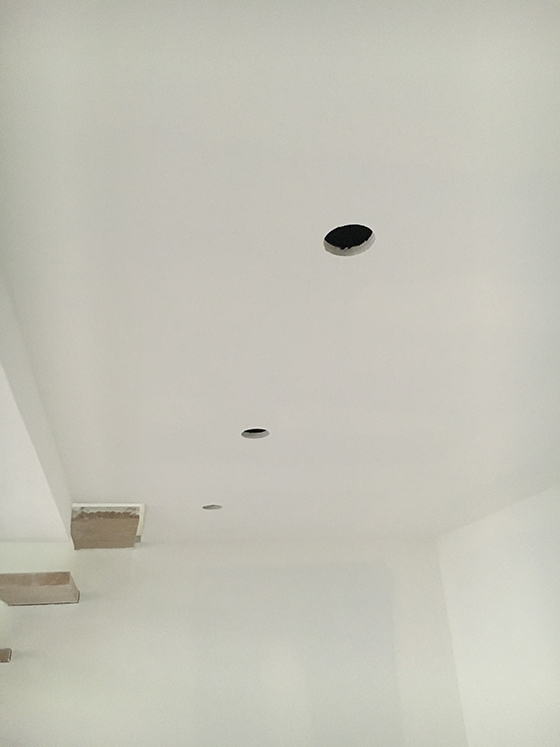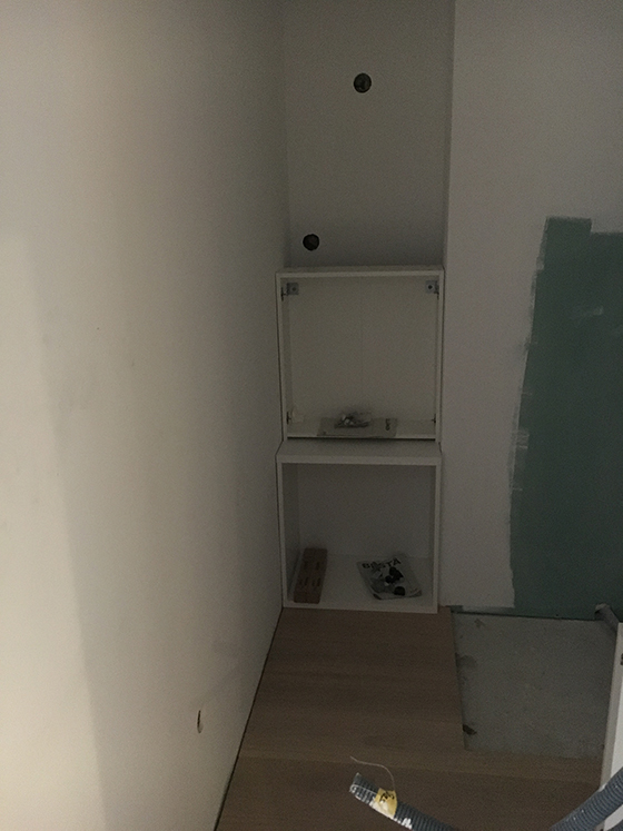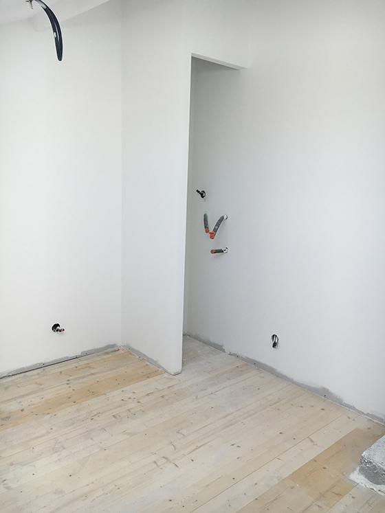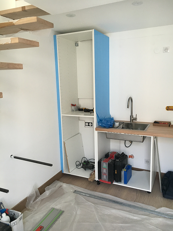 Finalisation doublage murs, poutres, garde corps mezzanine. Pose du compteur électrique encastré. Préparation des sorties électriques pour la cuisine integrée. Préparation des trous pour spots plafond.