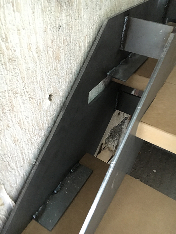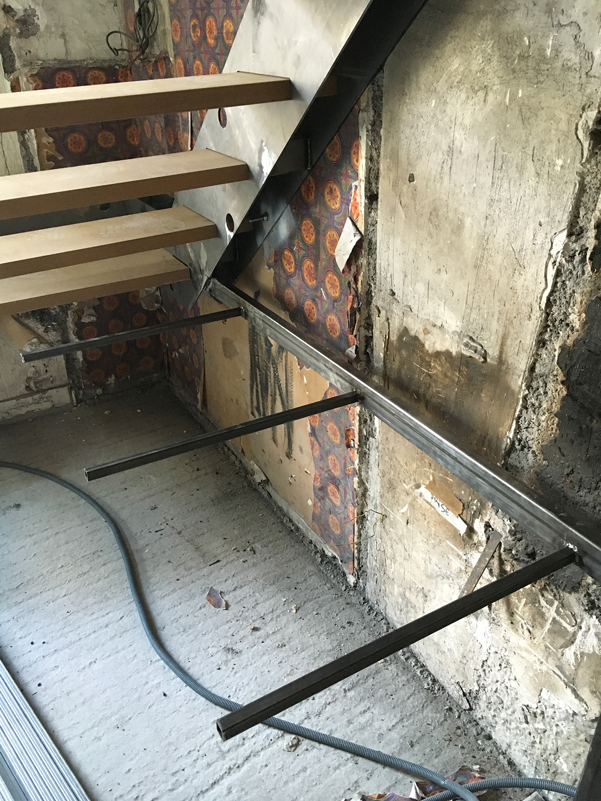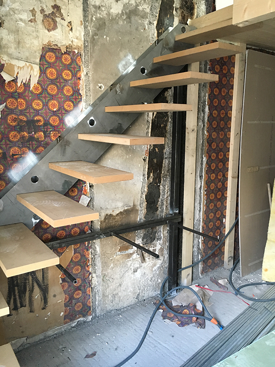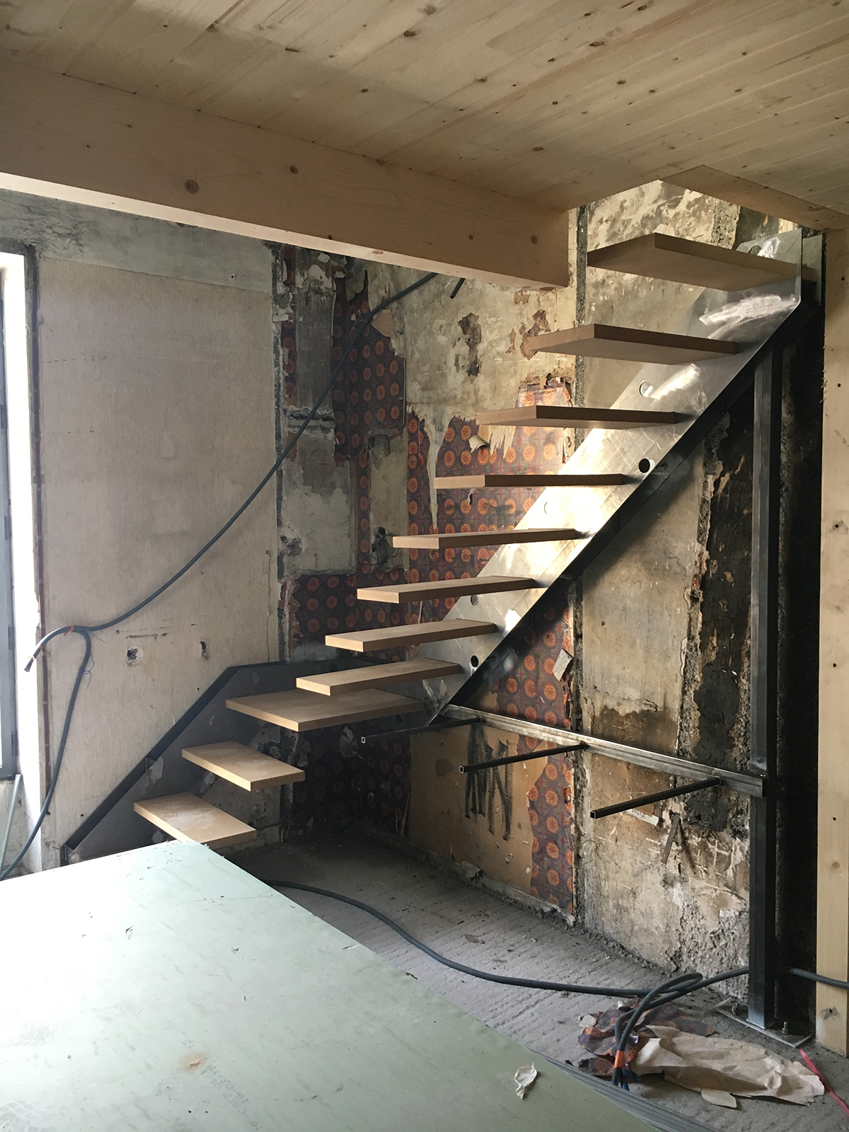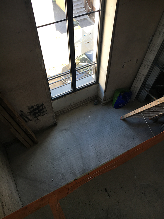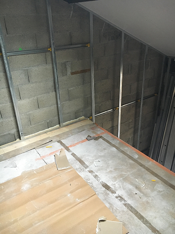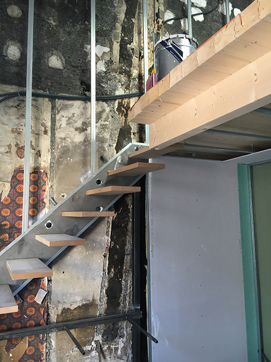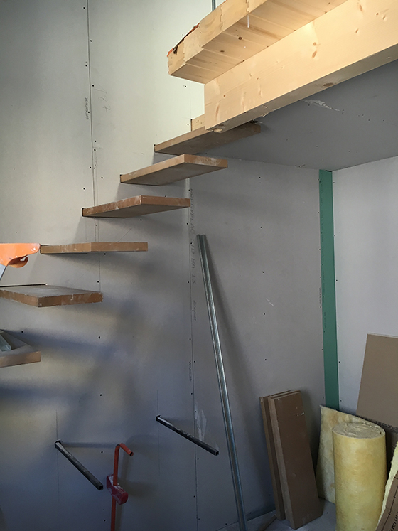 Finition de la phase 1 pour la mezzanine. Prise des mesures pour fabrication de l’escalier en atelier.