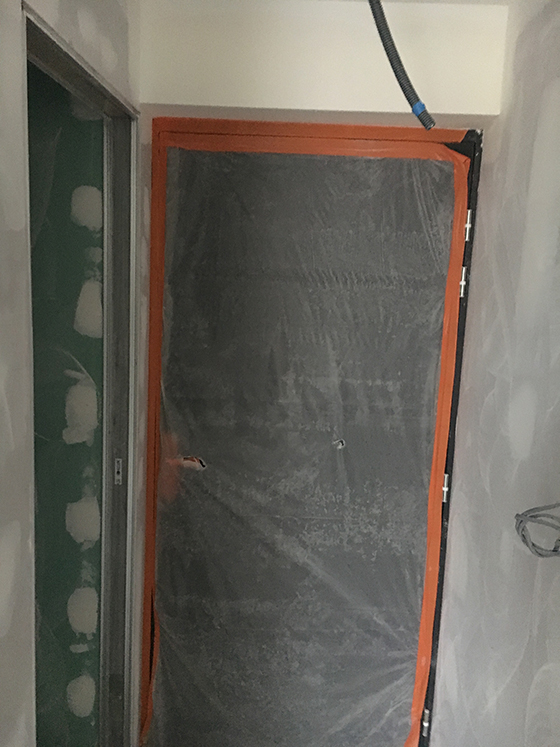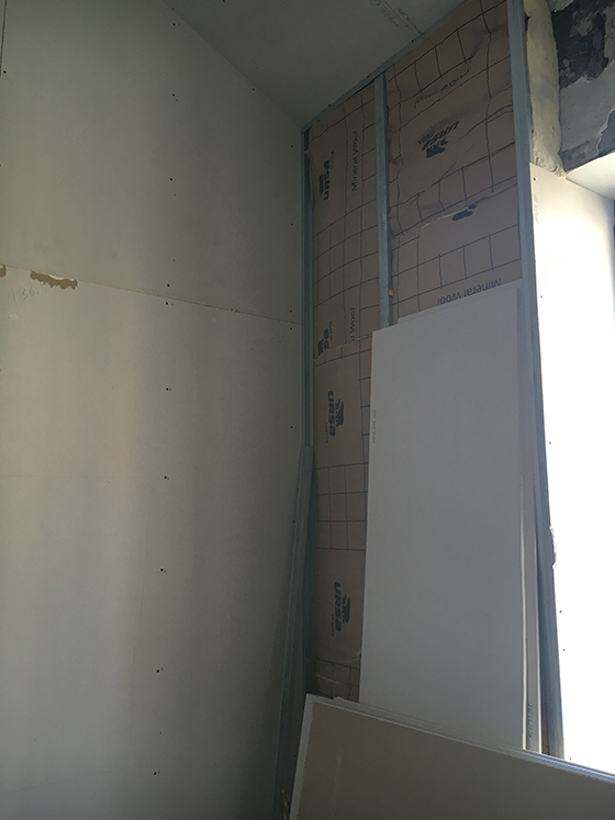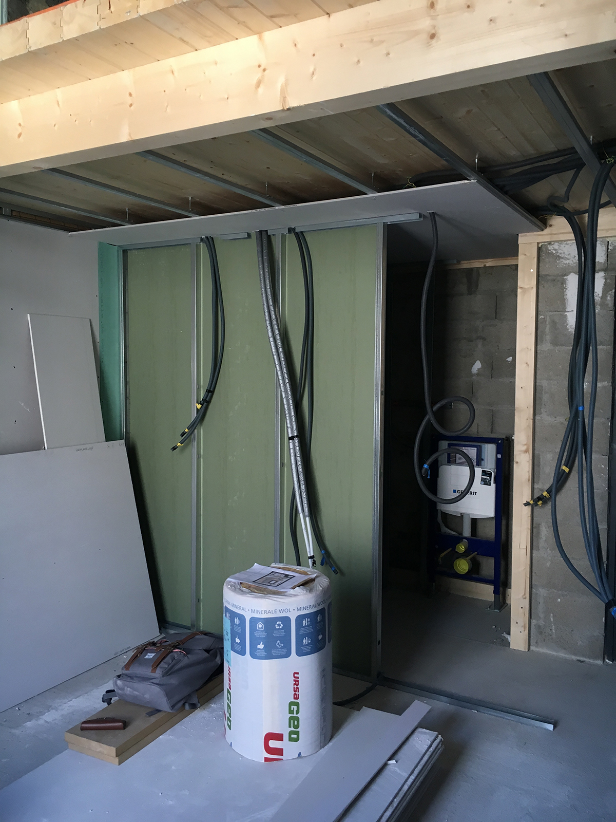 Poursuite doublage murs, plafonds. Pose de la cloison SDB/Cuisine et du chassis pour la porte coulissante (sans habillage).