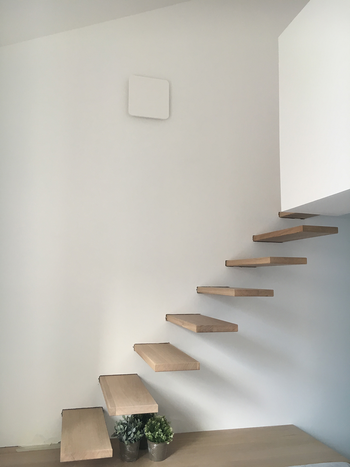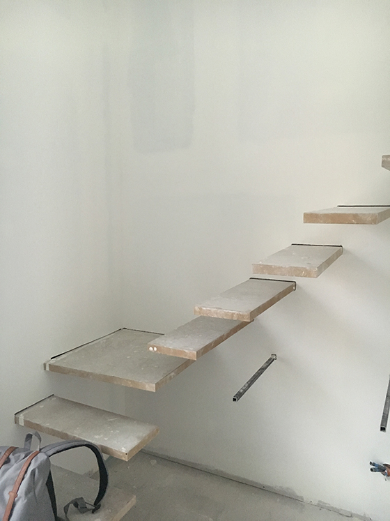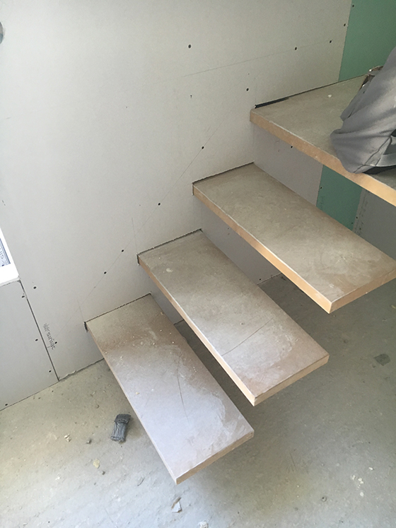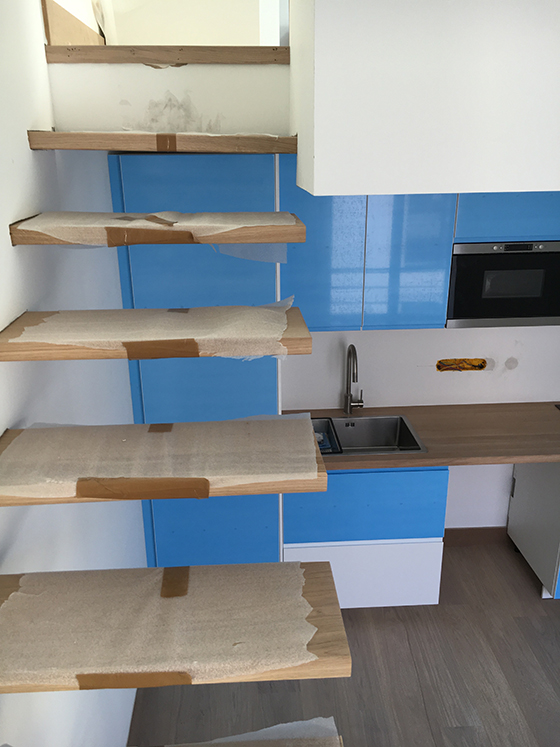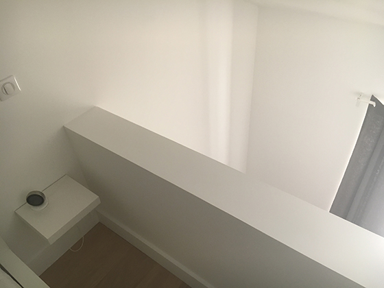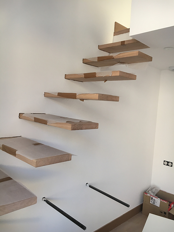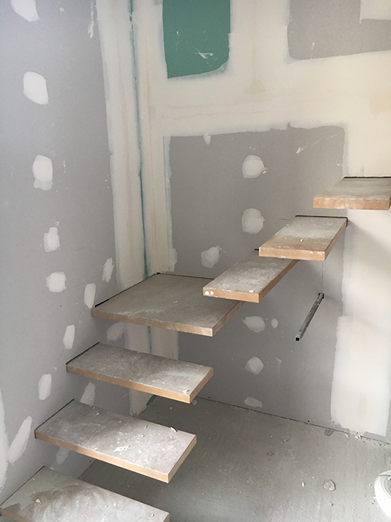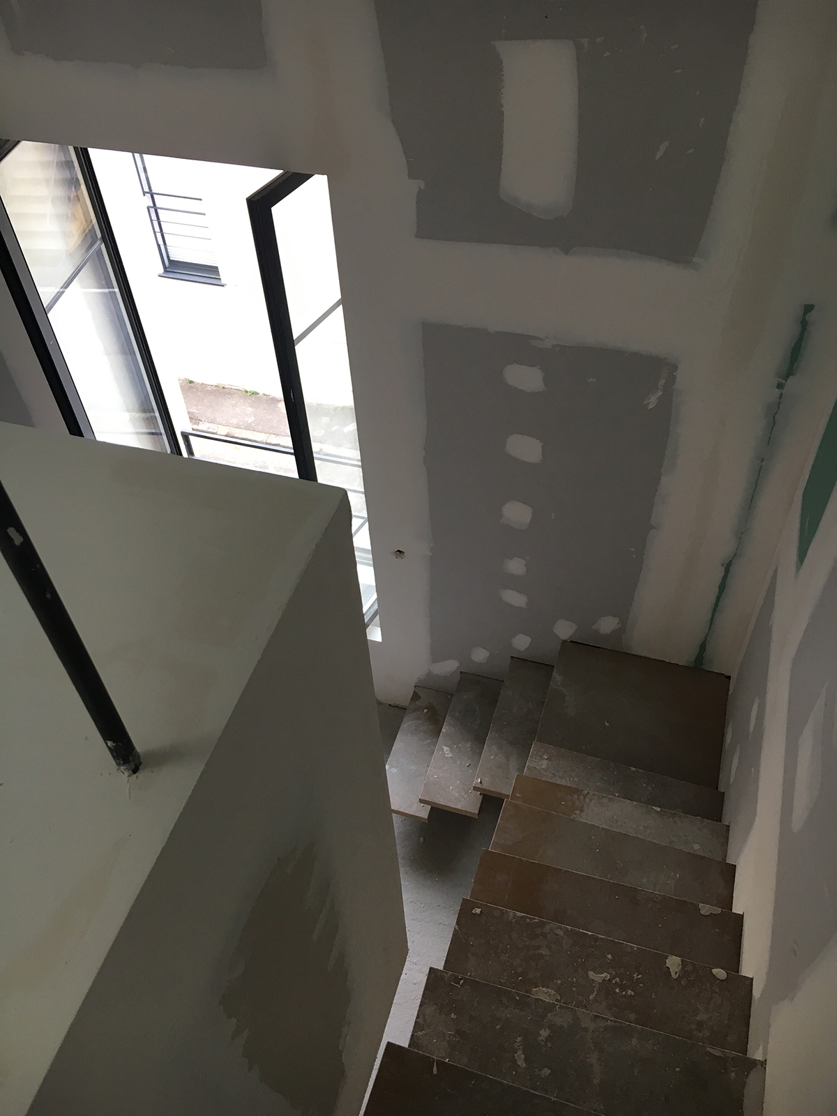 Marches d'escalier. Appareillage électrique. Porte coulissante sdb.