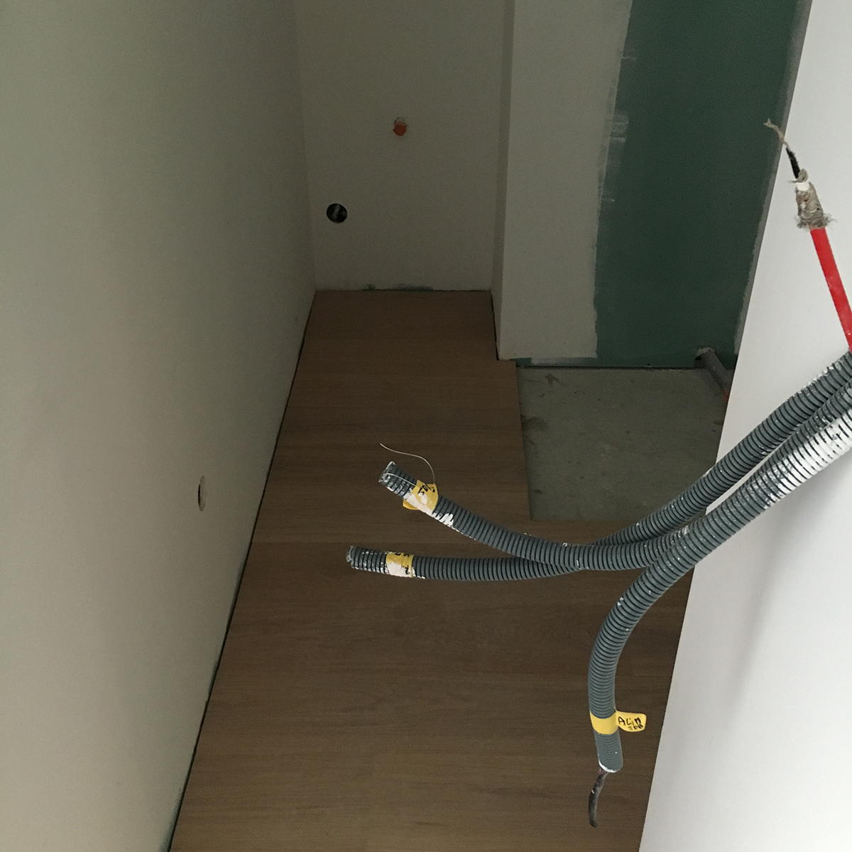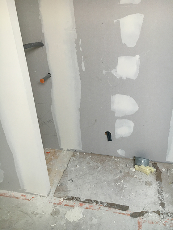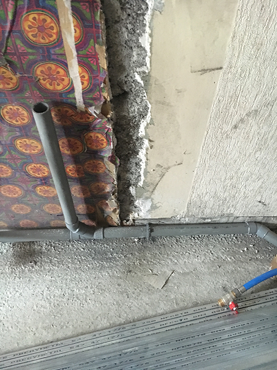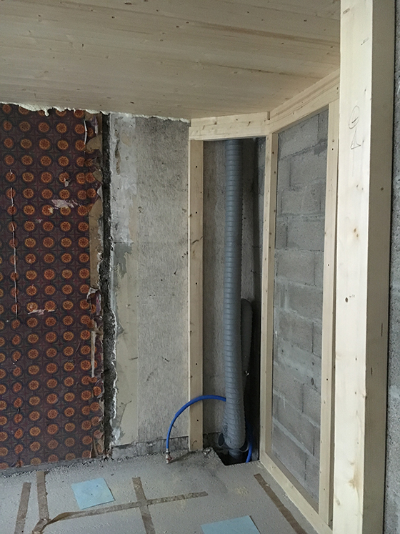 Début des travaux d'électricité et plomberie. Préparation des gaines electriques qui passeront dans les murs et plafond pour les prises, interrupteurs et spots. Pose du support WC et des canalisations salle de bain et cuisine.