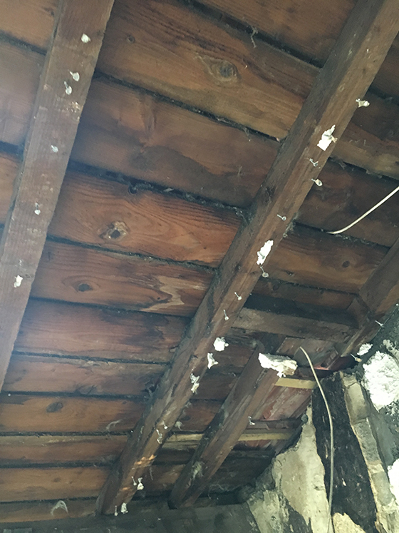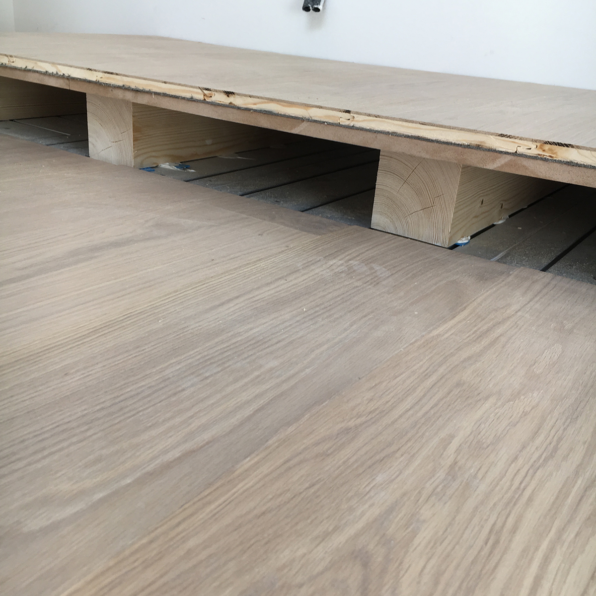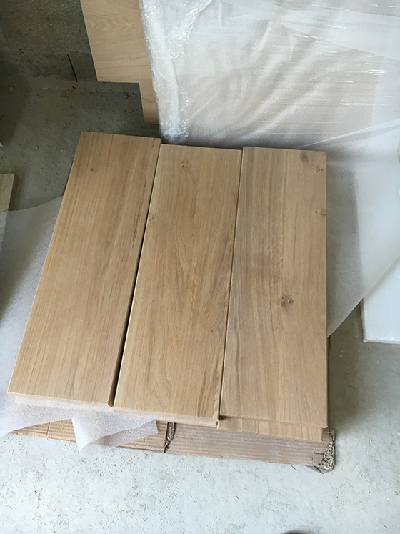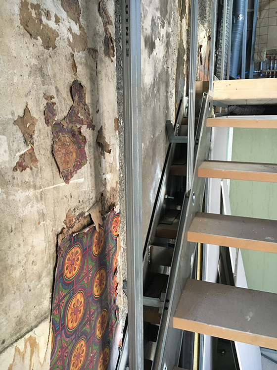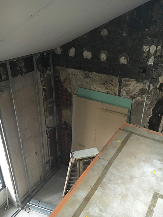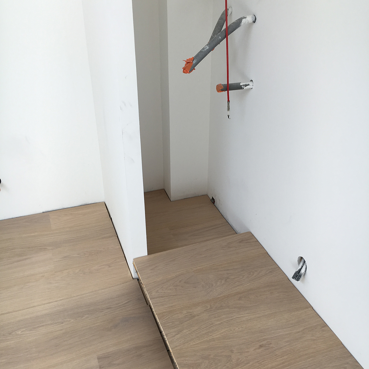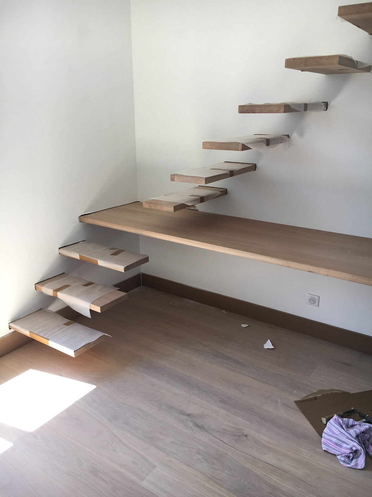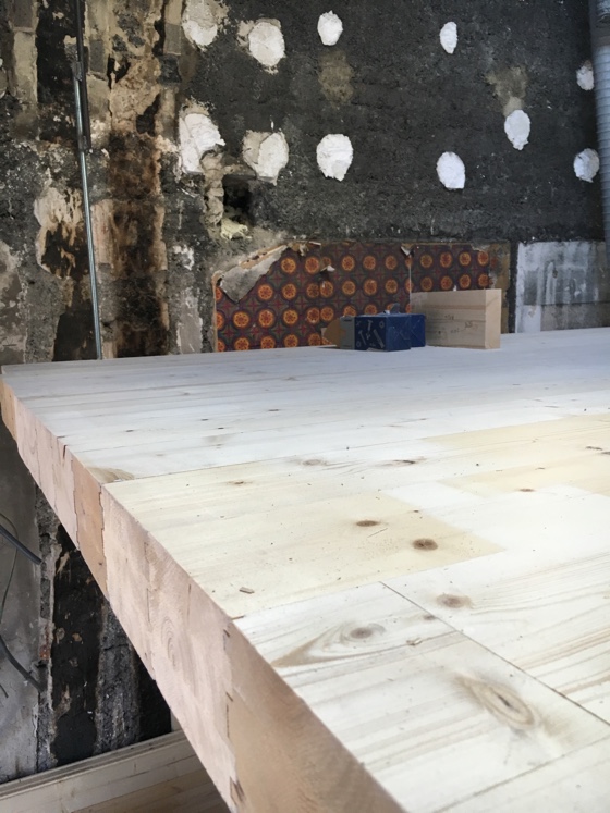 Rencontre des menuisiers. Reception du bois pour la mezzanine et début de la fabrication avec pose aux murs des bois pour le maintien et définir l’arrivée d’escalier ainsi que la hauteur définitive.
