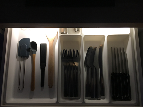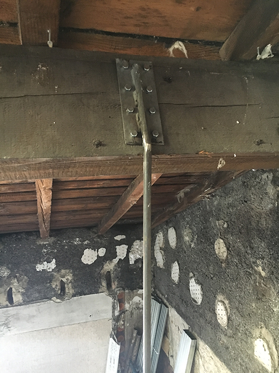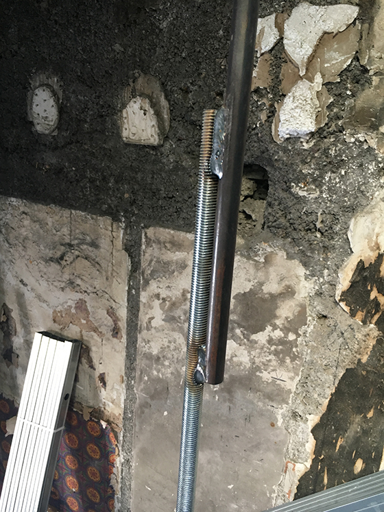 Poursuite du sol de la mezzanine. Suppression du poteau au sol et mise en place d’un tirant pour la suspendre et avoir un encombrement au sol minimum.