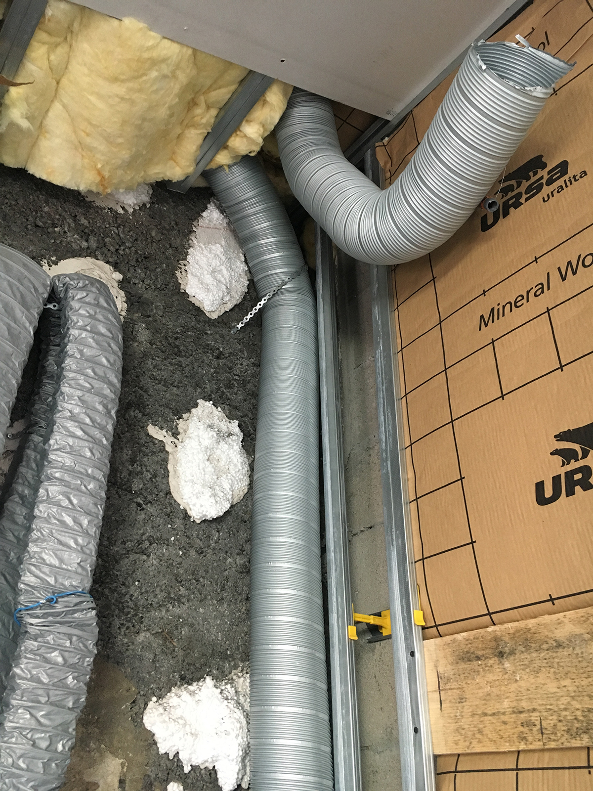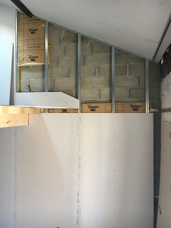 Pose des rails pour le doublage coté escalier. Début de la mise en place de l'isolation murs et plafonds. Pose de la cloison SDB/Cuisine. Remplacement de la gaine de ventilation initialement pas aux normes. Préparation VMC.